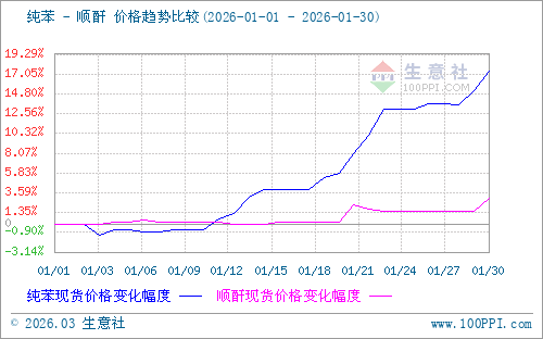 上游方面:1月山東地區(qū)純苯市場(chǎng)價(jià)格持續(xù)上漲。1月1日價(jià)格在5268.67元/噸;1月30日價(jià)格在6186.67元/噸,較月初上漲17.42%。國(guó)際原油期貨上漲,純苯外盤價(jià)格上漲,帶動(dòng)國(guó)內(nèi)純苯市場(chǎng)信心,買盤積極,純苯價(jià)格繼續(xù)拉漲。山東純苯地?zé)捠苡蛢r(jià)上漲提振信心,寬幅漲價(jià)遞盤。中石化華東、華南各煉廠純苯價(jià)格穩(wěn)定6000元/噸,1月28日?qǐng)?zhí)行。