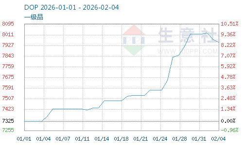 據(jù)生意社商品行情分析系統(tǒng),截止1月31日,DOP價格8017.50元/噸,較1月1日DOP價格7325.84元/噸大幅上漲,漲幅9.44%;2月4日DOP價格7950.84元/噸,較1月31日DOP價格8017.50元/噸下跌,跌幅0.83%。1月增塑劑DOP企業(yè)開工負荷小幅下降,開工率63%左右,DOP產(chǎn)量較上月下降;成本上漲加之供給下降,1月增塑劑DOP價格大幅上漲,下游上漲異辛醇需求上漲支撐加大。2月DOP企業(yè)開工小幅提升,增塑劑供給增加,加之春節(jié)前備貨接近尾聲需求回落,2月增塑劑價格下跌,需求支撐回落,異辛醇上漲支撐減弱。