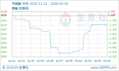 本周,丙烯酸市場(chǎng)在成本支撐與需求疲軟的博弈中,整體維持穩(wěn)定運(yùn)行,市場(chǎng)情緒趨于謹(jǐn)慎樂(lè)觀,截止2月10日,生意社丙烯酸基準(zhǔn)價(jià)為6116.67元/噸,與本月初持平。