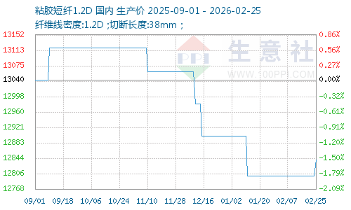 據(jù)生意社商品行情分析系統(tǒng)監(jiān)測,2026年2月25日,粘膠短纖市場均價為12840元/噸,較上一工作日價格上漲40元/噸。