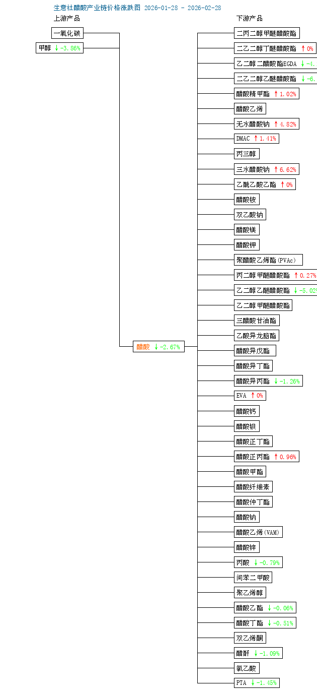 | 2月28日華北地區(qū)醋酸價格下跌,周邊送到價在2670元/噸左右,價格下調(diào)30元/噸,醋酸企業(yè)出貨不佳,下游需求 |