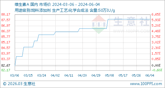 6月4日,生意社維生素A基準(zhǔn)價(jià)為87.67元/公斤,與本月初持平。
