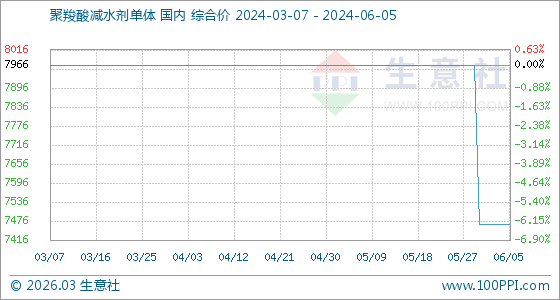 6月5日,生意社聚羧酸減水劑單體基準價為7466.67元/噸,與本月初持平。