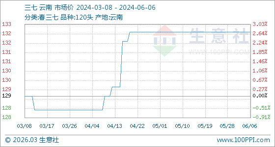 6月6日,生意社三七基準(zhǔn)價為133.00元/公斤,與本月初持平。