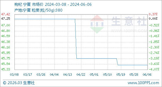 6月6日,生意社枸杞基準(zhǔn)價(jià)為45.50元/公斤,與本月初持平。