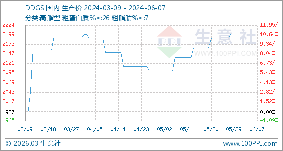 6月7日,生意社DDGS基準(zhǔn)價為2203.33元/噸,與本月初持平。