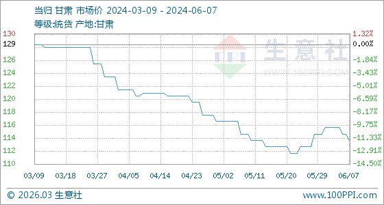 6月7日,生意社當(dāng)歸基準價為115.00元/公斤,與本月初(116.00元/公斤)相比,下降了-0.86%。