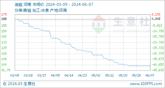 6月7日,生意社連翹基準(zhǔn)價(jià)為98.75元/公斤,與本月初持平。
