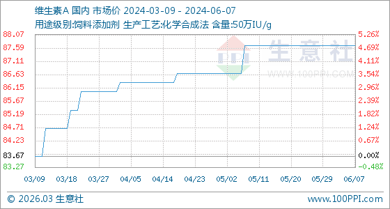 6月7日,生意社維生素A基準價為87.67元/公斤,與本月初持平。