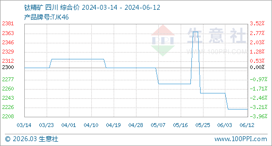 6月12日,生意社鈦精礦基準(zhǔn)價(jià)為2223.33元/噸,與本月初(2253.33元/噸)相比,下降了-1.33%。
