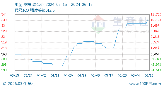 6月13日,生意社水泥基準(zhǔn)價(jià)為340.00元/噸,與本月初(336.00元/噸)相比,上漲了1.19%。