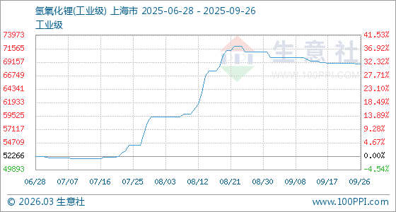 9月26日,生意社氫氧化鋰(工業(yè)級)基準(zhǔn)價為68900.00元/噸,與本月初(70933.33元/噸)相比,下降了2.87%。
