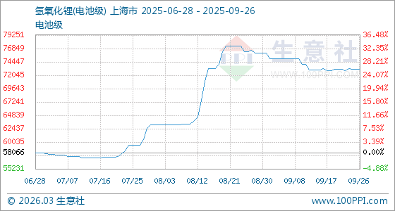 9月26日,生意社氫氧化鋰(電池級(jí))基準(zhǔn)價(jià)為73166.67元/噸,與本月初(76050.00元/噸)相比,下降了3.79%。