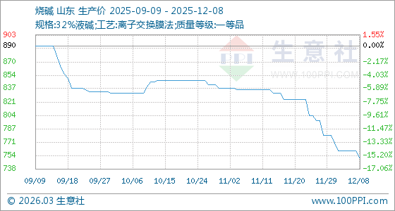 12月8日,生意社燒堿基準價為760.00元/噸,與本月初(780.00元/噸)相比,下降了2.56%。