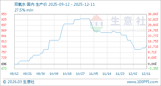 12月11日,生意社雙氧水基準價為780.00元/噸,與本月初(820.00元/噸)相比,下降了4.88%。