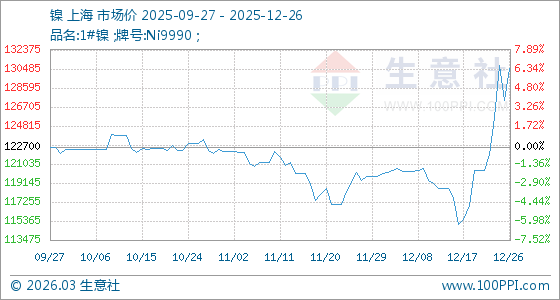 12月26日,生意社鎳基準(zhǔn)價(jià)為127383.33元/噸,與本月初(119833.33元/噸)相比,上漲了6.30%。