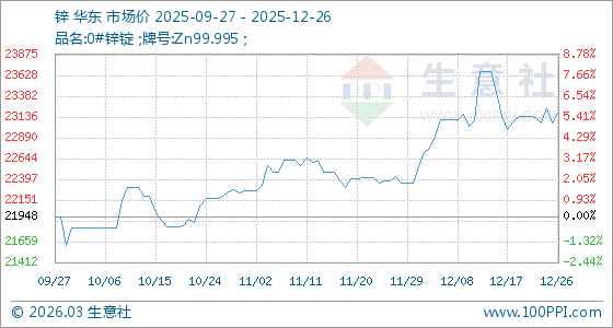 12月26日,生意社鋅基準價為23060.00元/噸,與本月初(22356.00元/噸)相比,上漲了3.15%。
