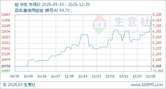 12月29日,生意社鋁基準(zhǔn)價(jià)為22030.00元/噸,與本月初(21460.00元/噸)相比,上漲了2.66%。