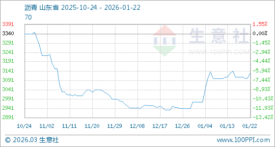 1月22日,生意社瀝青基準(zhǔn)價(jià)為3103.33元/噸,與本月初(2973.33元/噸)相比,上漲了4.37%。