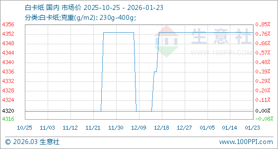 1月23日,生意社白卡紙基準(zhǔn)價(jià)為4353.33元/噸,與本月初持平。