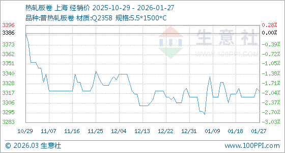 1月27日,生意社熱軋板卷基準(zhǔn)價(jià)為3323.33元/噸,與本月初(3313.33元/噸)相比,上漲了0.30%。