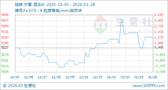 1月28日,生意社硅鐵基準價為5294.29元/噸,與本月初(5285.71元/噸)相比,上漲了0.16%。