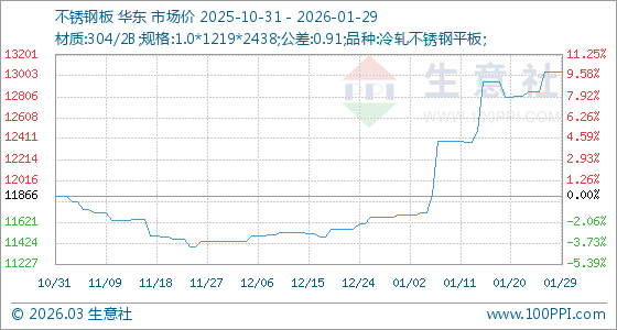 1月29日,生意社不銹鋼板基準(zhǔn)價(jià)為13036.67元/噸,與本月初(11691.67元/噸)相比,上漲了11.50%。