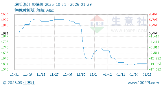 1月29日,生意社廢紙基準價為1602.00元/噸,與本月初(1720.00元/噸)相比,下降了6.86%。
