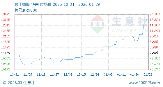 1月29日,生意社順丁橡膠基準(zhǔn)價(jià)為13180.00元/噸,與本月初(11580.00元/噸)相比,上漲了13.82%。