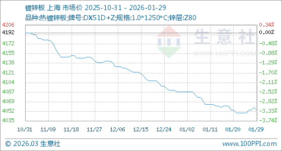 1月29日,生意社鍍鋅板基準(zhǔn)價為4060.00元/噸,與本月初(4087.50元/噸)相比,下降了0.67%。