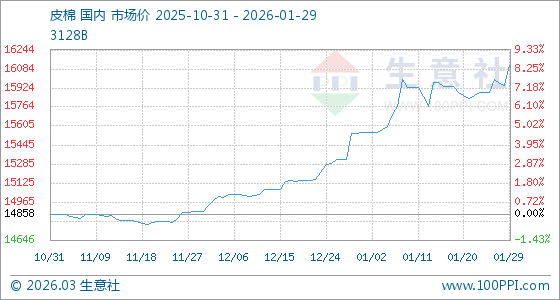 1月29日,生意社皮棉基準價為15942.50元/噸,與本月初(15549.17元/噸)相比,上漲了2.53%。