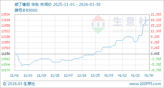 1月30日,生意社順丁橡膠基準(zhǔn)價(jià)為13200.00元/噸,與本月初(11580.00元/噸)相比,上漲了13.99%。