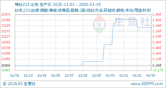 1月30日,生意社棉紗21S基準(zhǔn)價(jià)為22200.00元/噸,與本月初(22066.67元/噸)相比,上漲了0.60%。