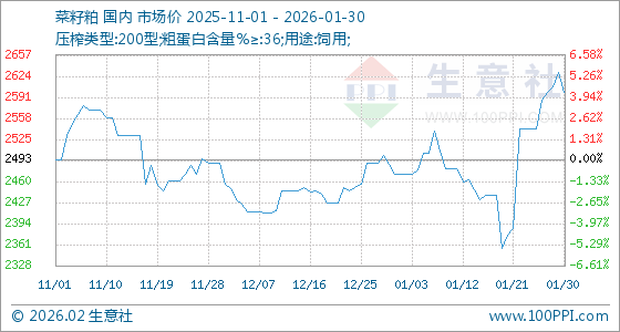 1月30日,生意社菜籽粕基準(zhǔn)價為2630.00元/噸,與本月初(2471.67元/噸)相比,上漲了6.41%。