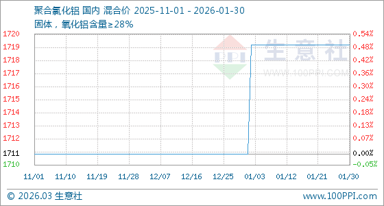 1月30日,生意社聚合氯化鋁基準價為1720.00元/噸,與本月初(1711.67元/噸)相比,上漲了0.49%。