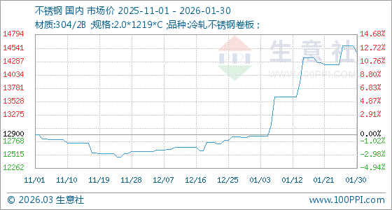 1月30日,生意社不銹鋼基準價為14583.33元/噸,與本月初(12873.33元/噸)相比,上漲了13.28%。