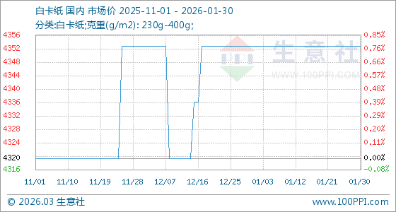 1月30日,生意社白卡紙基準價為4353.33元/噸,與本月初持平。