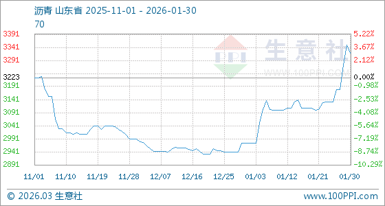 1月30日,生意社瀝青基準(zhǔn)價(jià)為3350.00元/噸,與本月初(2973.33元/噸)相比,上漲了12.67%。