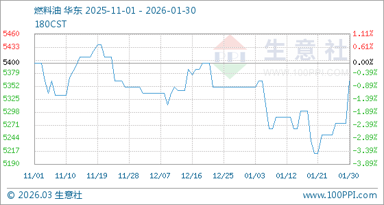 1月30日,生意社燃料油基準價為5275.00元/噸,與本月初(5350.00元/噸)相比,下降了1.4%。