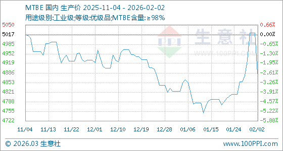 2月2日,生意社MTBE基準(zhǔn)價(jià)為5023.33元/噸,與本月初持平。