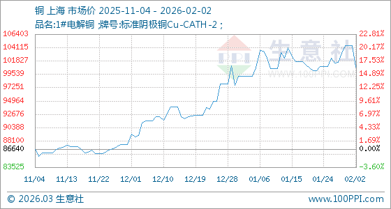 2月2日,生意社銅基準價為104496.67元/噸,與本月初持平。