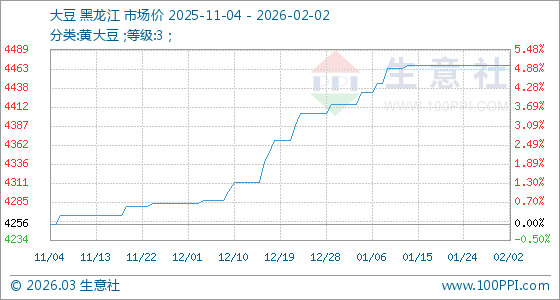 2月2日,生意社大豆基準(zhǔn)價(jià)為4468.00元/噸,與本月初持平。