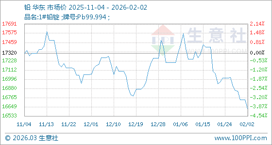 2月2日,生意社鉛基準(zhǔn)價為16735.00元/噸,與本月初持平。