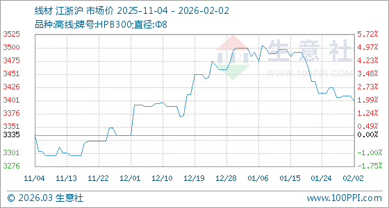 2月2日,生意社線材基準(zhǔn)價為3410.00元/噸,與本月初持平。
