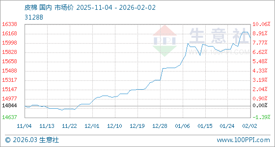 2月2日,生意社皮棉基準價為16196.50元/噸,與本月初持平。