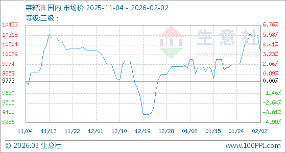 2月2日,生意社菜籽油基準價為10298.00元/噸,與本月初持平。