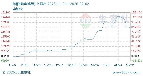2月2日,生意社碳酸鋰(電池級)基準(zhǔn)價(jià)為150000.00元/噸,與本月初持平。