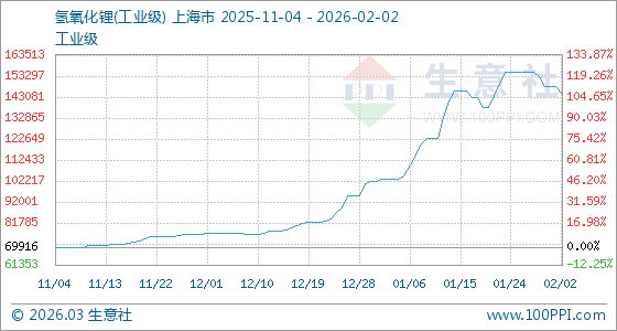 2月2日,生意社氫氧化鋰(工業(yè)級(jí))基準(zhǔn)價(jià)為148000.00元/噸,與本月初持平。