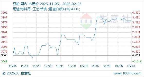 2月3日,生意社豆粕基準價為3178.00元/噸,與本月初持平。