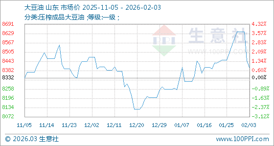 2月3日,生意社大豆油基準(zhǔn)價(jià)為8448.00元/噸,與本月初(8640.00元/噸)相比,下降了2.22%。
